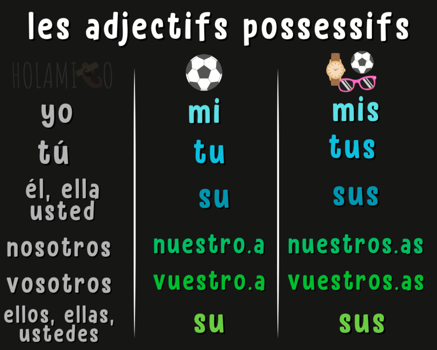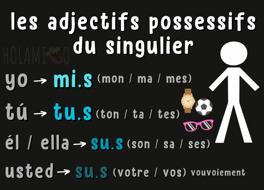 ⚠ Attention : en espagnol, les adjectifs possessifs du singulier s’accordent en nombre (singulier/pluriel), mais pas en genre (masculin / féminin).