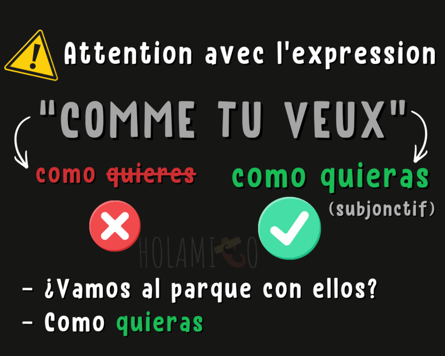 En résumé, retiens que pour dire « comme tu veux » dans le sens de « peu importe » : como quieres ❌ / como quieras ✅.