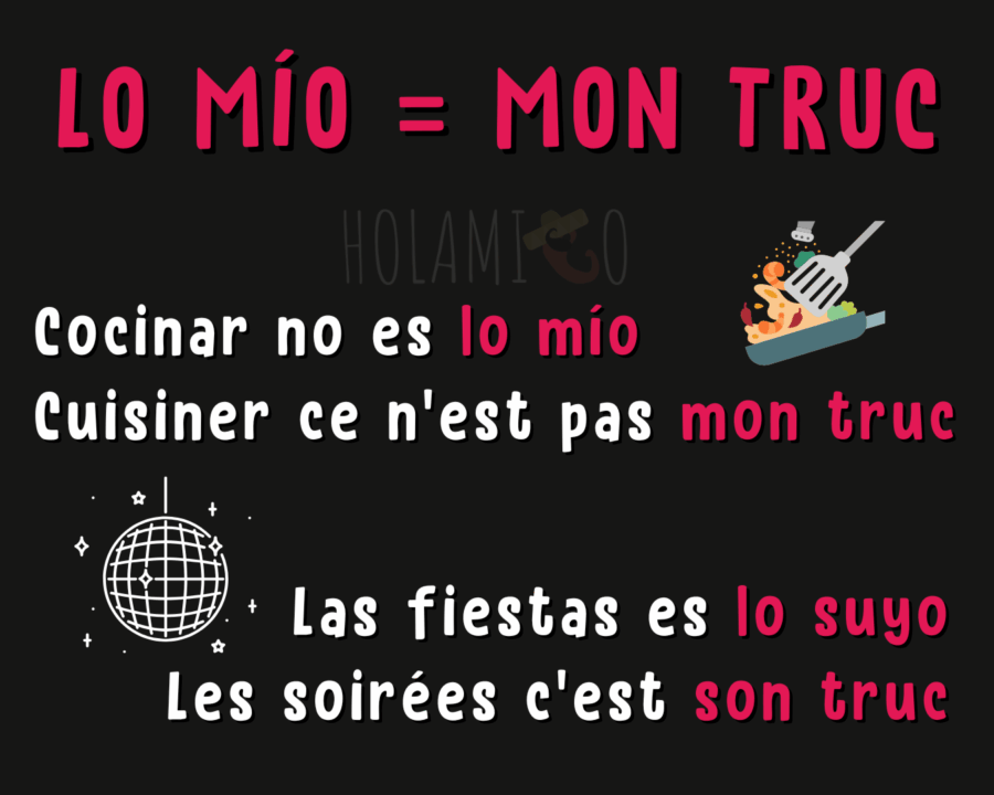 LO mío, LO tuyo, LO suyo, etc. permettent de dire « mon truc / ton truc / son truc, etc. », pour parler de ce qui nous caractérise ou nous correspond, ou pour désigner ce que quelqu’un aime ou maîtrise (ou non).
