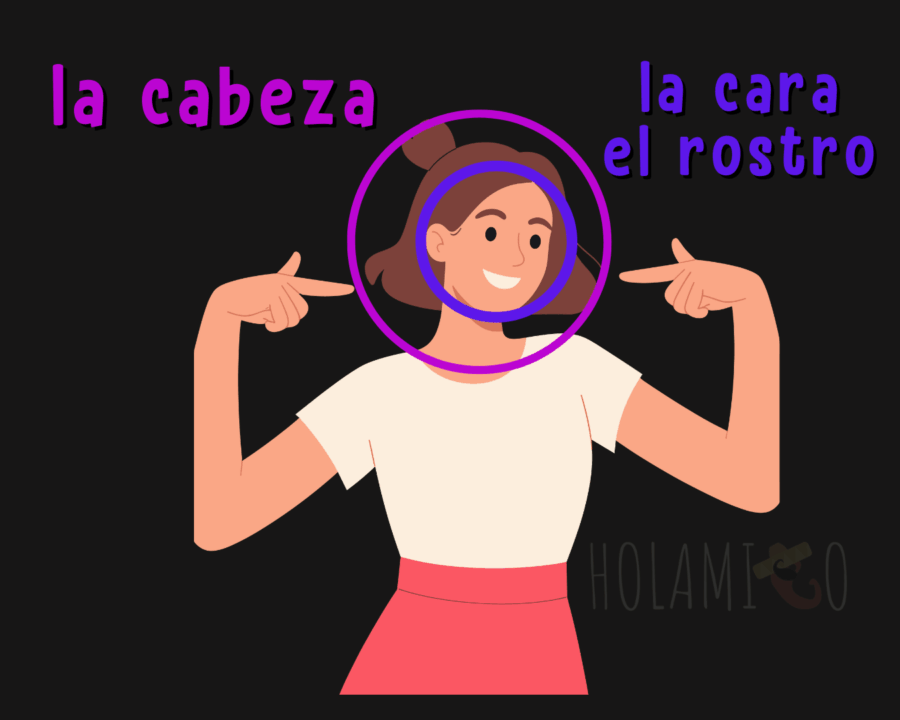 Le visage en espagnol (la cara ou el rostro) fait partie de la tête (la cabeza), comme tu peux le voir sur ce schéma :