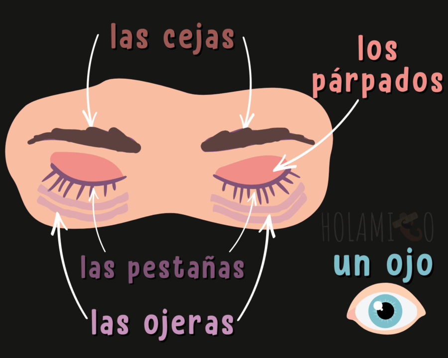 Retrouve toutes les parties autour des yeux en espagnol dans ce schéma :